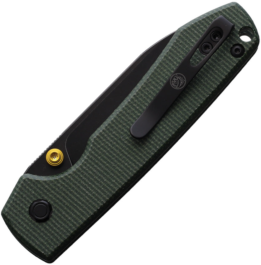 4.38" (11.13cm) closed. 3.25" (8.26cm) black stonewash finish 14C28N Sandvik stainless blade. Green canvas micarta handle. Thumb stud. Lanyard hole. Pocket clip. Black nylon zippered storage case. Boxed.