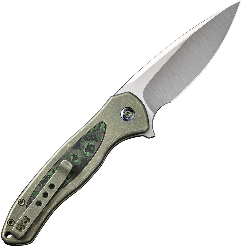 4.25" (10.8cm) closed. 3.25" (8.26cm) stonewash and satin finish CPM-20CV stainless blade. Green stonewash finish titanium handle with Jungle Fat Carbon inlay. Extended tang. Lanyard hole. Pocket clip. Limited edition of 155 pieces. Black nylon zippered storage case. Boxed.