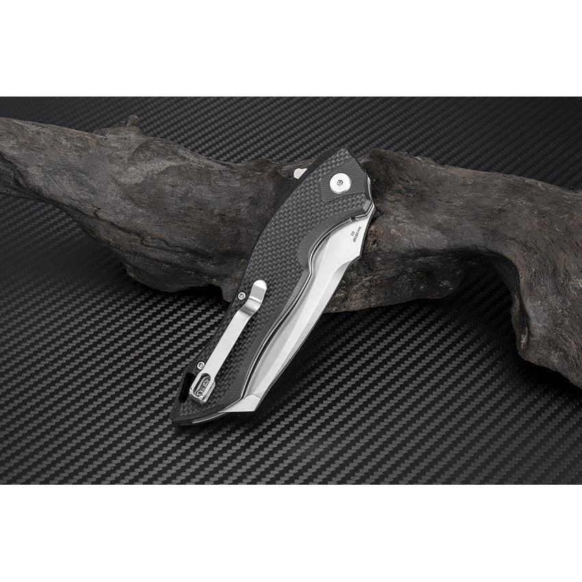 5" closed. 3.63" stonewash finish D2 tool steel curved blade. Black G10 handle. Extended tang. Lanyard hole. Pocket clip. Boxed.