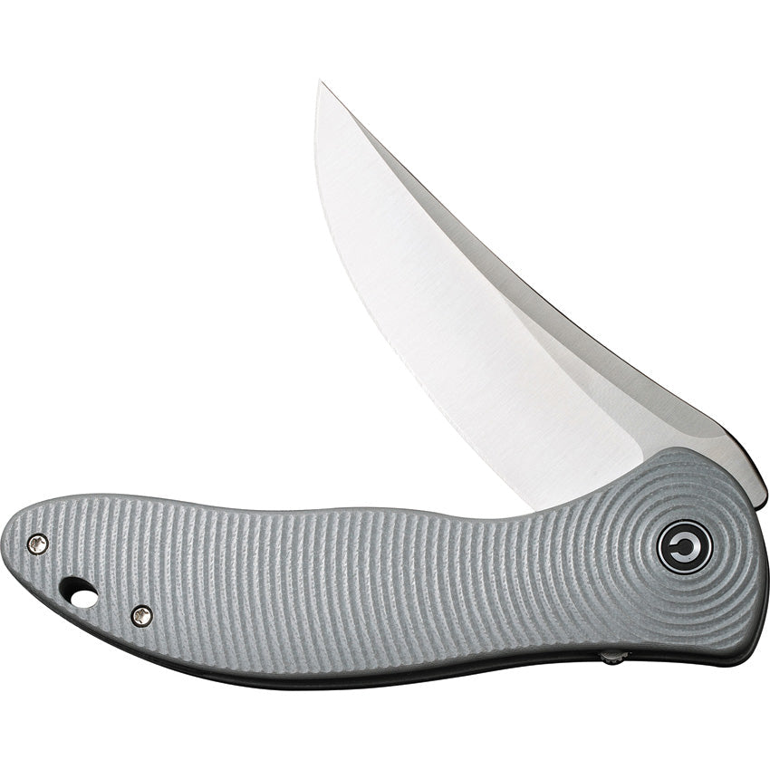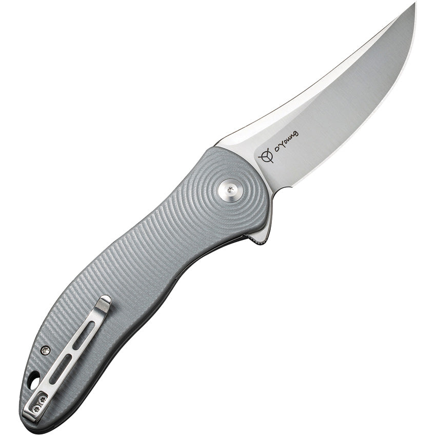 5.38" (13.67cm) closed. 4" (10.16cm) satin finish Nitro V steel trailing point blade. Gray sculpted G10 handle. Extended tang. Lanyard hole. Pocket clip. Black nylon zippered storage case. Boxed.
