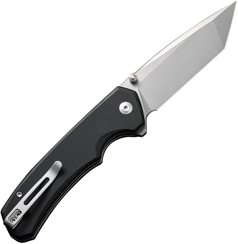4.5" (11.43cm) closed. 3.5" (8.89cm) stonewash finish 14C28N Sandvik stainless tanto blade. Black G10 handle. Extended tang. Thumb stud. Pocket clip. Black nylon zippered storage case. Boxed.