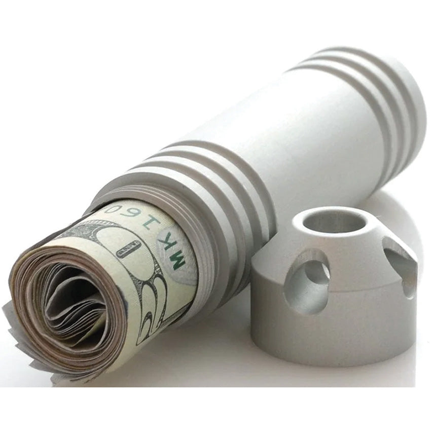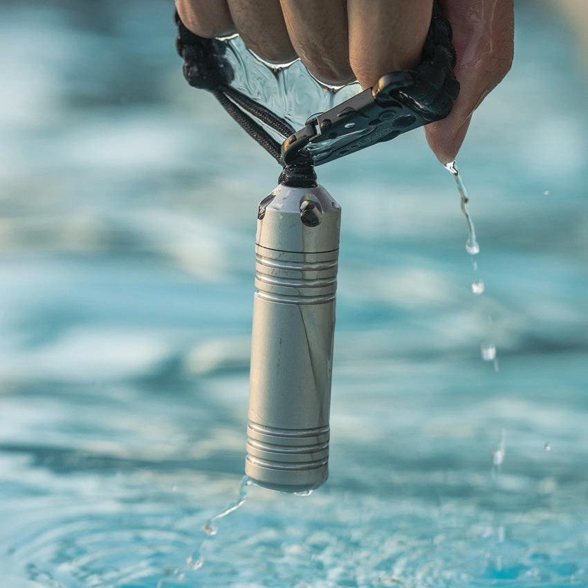 Waterproof to 1000 feet. Food safe. Quad Loop secure cap for tethering options. Internal dimensions: 0.75" x 2.95". Aluminum construction. Color: Silver. Hang packaged.
