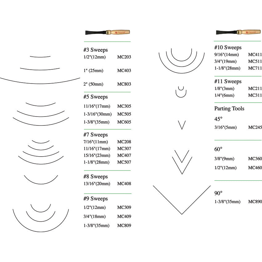 carbon steel blade. Wood handle. Includes: MC203 #3 x 1/2; MC403 #3 x 1; MC505 #5 x 1-3/16; MC307 #7 x 11/16; MC309 #9 x 1/2; MC511 #10 x 3/4; MC211 #11 x 1/8; MC311 #11 x 1/4; MC245 45 deg. X 3/16; and MC460 60 deg. X 1/2. Versatile gouges range from 1/8 for detail to 1 1/4 for hogging off large amounts of waste wood. Ideal for carving large projects or denser hardwoods. These tools can be used by hand or can be struck with a mallet and will suit the needs of advanced and beginning carvers. Storage case.