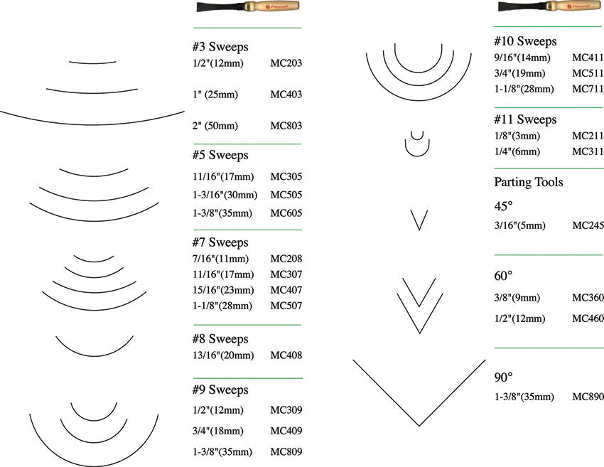 carbon steel blade. Wood handle. Includes: MC803 #3 x 2; MC605 #5 x 1-3/8; MC711 #10 x 1-1/8; and MC890 90 deg. X 1-3/8. Sized for very large stock removal. Handle diameter and steel caliper are twenty percent larger for heavy duty projects. These tools can be used by hand or can be struck with a mallet. Storage case.