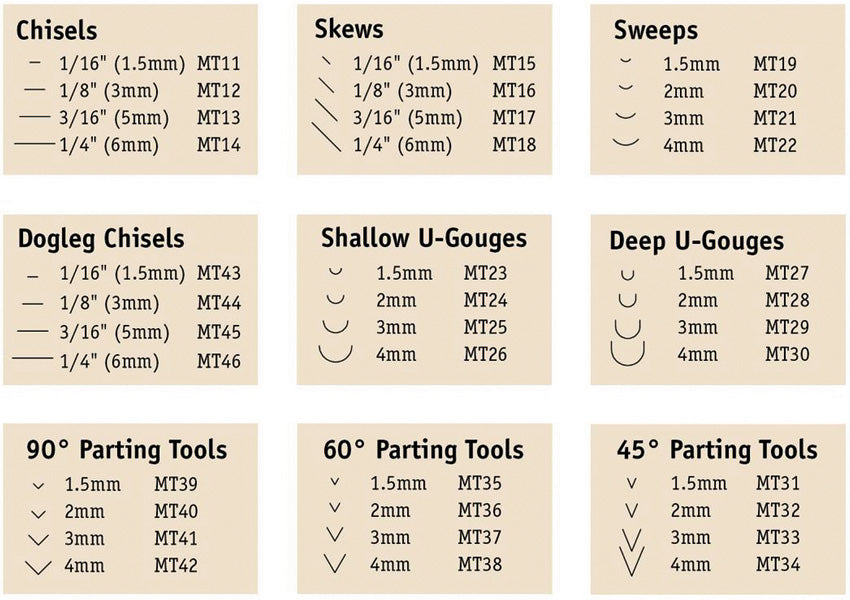 This set features four micro chisels. Micro Tools included: MT11 1/16" (1.5mm), MT12 1/8" (3mm), MT13 3/16" (5mm), and MT14 1/4" (6mm). Perfect for: miniature and fine detail work, cleaning up ridges created by gouge cuts, cleaning up tight corners and accessing tight spaces. Hang packaged.