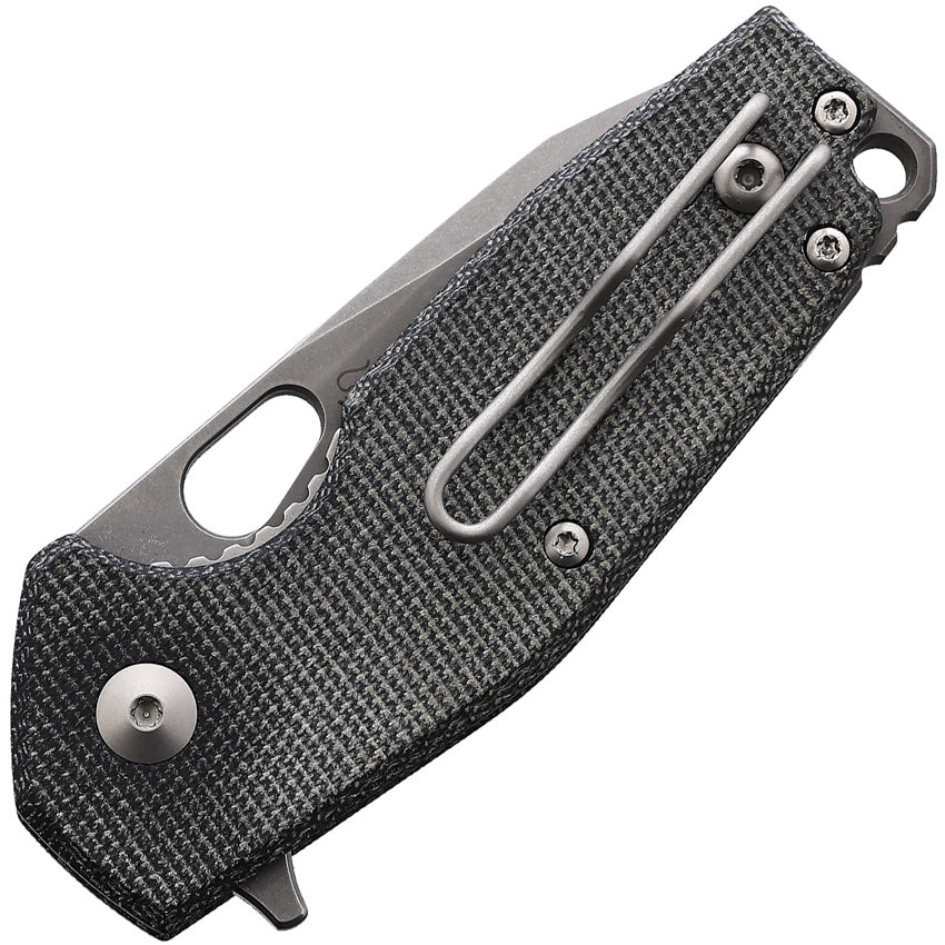 3.5" (8.89cm) closed. 2.5" (6.35cm) stonewash finish Bohler M390 stainless blade. Black canvas micarta handle. Thumb pull. Extended tang. Lanyard hole. Pocket clip. Black leather pouch. Boxed.