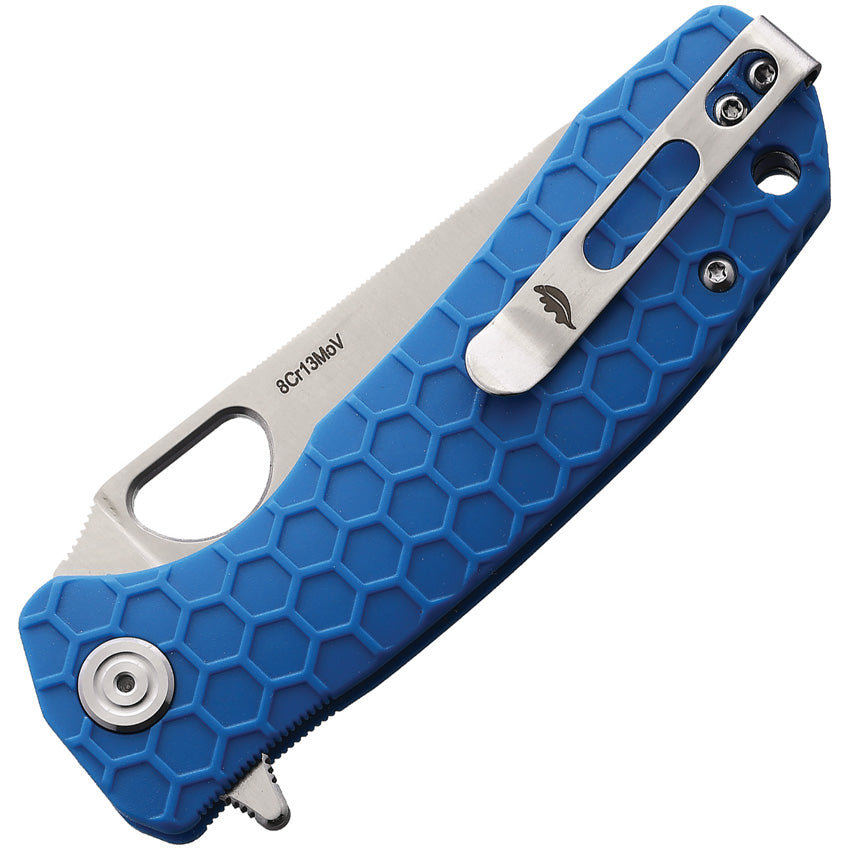 4.13" (10.49cm) closed. 3.25" (8.26cm) satin finish 8Cr13MoV stainless blade. Extended tang. Lanyard hole. Pocket clip. Thumb pull. Blue textured nylon and glass fiber handle. Boxed.