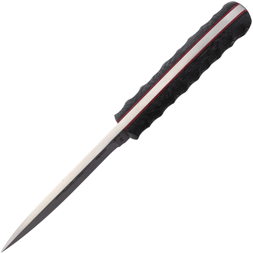 9" (22.86cm) overall. 4.25" (10.8cm) satin finish MV-58 stainless blade. Black sculpted micarta handle. Lanyard hole. Red liners. Black leather belt sheath. Boxed.