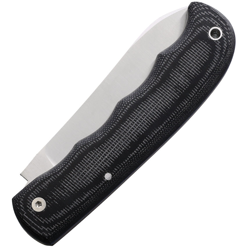 3.38" (8.59cm) closed. 2.38" (6.05cm) satin finish 14C28N Sandvik stainless blade. Black TRF handle. Lanyard hole. Blue liners. Boxed.