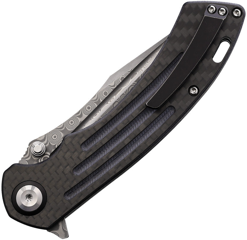 4.75" (12.07cm) closed. 3.75" (9.53cm) Damascus steel tanto blade. Extended tang. Lanyard hole. Pocket clip. Thumb stud. Black carbon fiber and G10 handle. Black nylon pouch. Boxed.