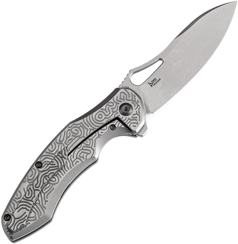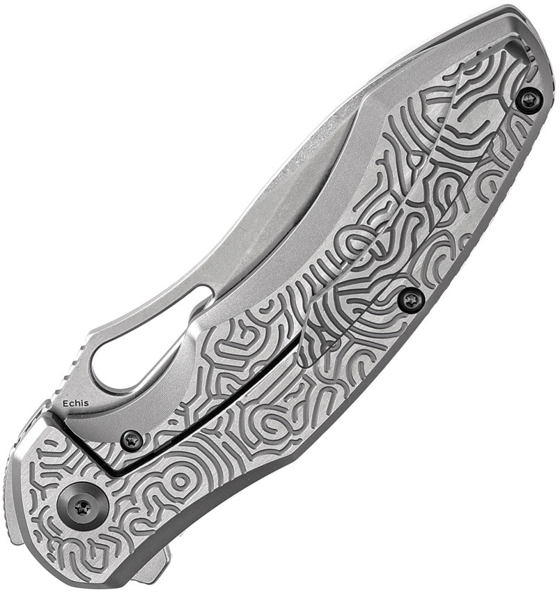 4.5" (11.43cm) closed. 3.5" (8.89cm) stonewash finish CPM S35VN stainless drop point blade. Gray textured titanium handle. Extended tang. Thumb pull. Pocket clip. Black nylon pouch. Boxed.