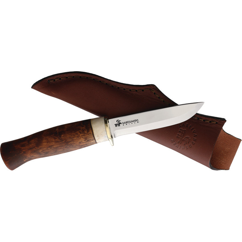 8.25" (20.96cm) overall. 4" (10.16cm) 12C27 Sandvik stainless blade. Oiled curly Birch handle. Reindeer antler bolster(s). Brass guard. Brown leather belt sheath. Boxed with hanging tab.