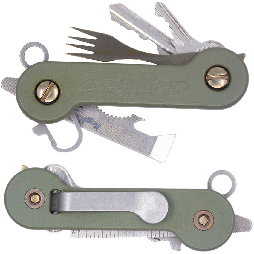 3.5" overall. Green G10 construction. Tools include: Pocket clip and Key fob. Screws included (to hold 4, 8, or 12 keys). Load keys in preferred order. O-rings keep keys snug and allow for adjustment of tension. Washers between keys for easy deployment. Includes link for key fob. Holds up to 12 keys. Keys and accessories not included. Hang packaged.