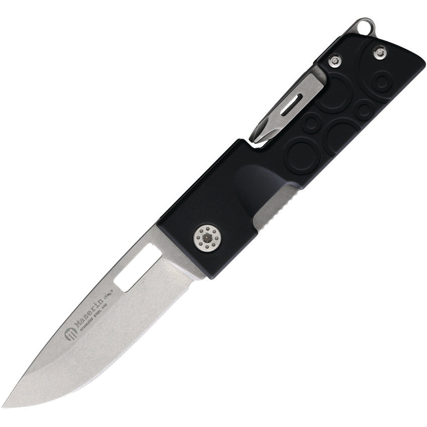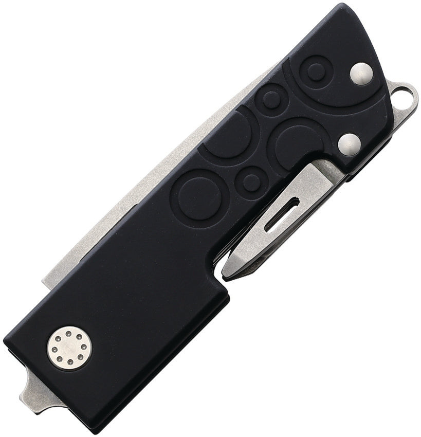 3.5" (8.89cm) closed. Stonewash finish 440 stainless blade. Black anodized aluminum handle. Tools include: Flat head screwdriver l Keyring l Phillips screwdriver l Awl l Reamer with sewing eye. Black nylon belt sheath. Boxed.