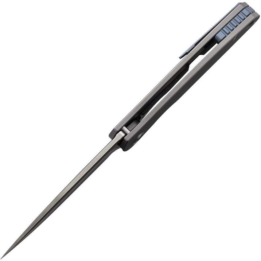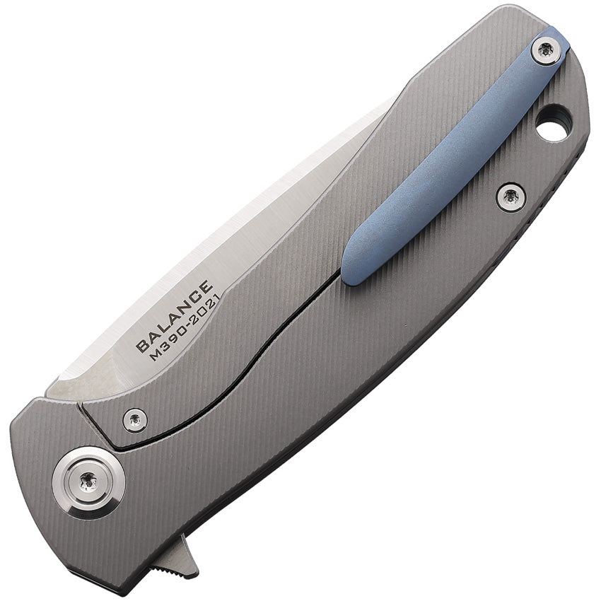 4.75" (12.07cm) closed. 3.75" (9.53cm) satin finish Bohler M390 stainless blade. Gray textured titanium handle. Extended tang. Lanyard hole. Pocket clip. Black nylon zippered storage case. Boxed.