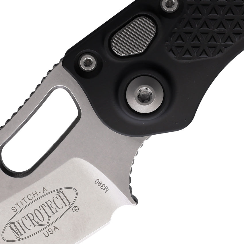 Automatic opening. 5" (12.7cm) closed. 3.75" (9.53cm) stonewash finish premium steel Wharncliffe blade. Black aluminum handle. Thumb pull. Lanyard hole. Pocket clip. Boxed.