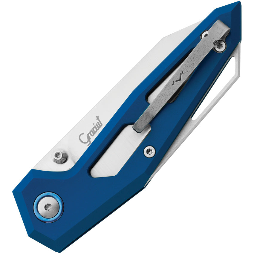 4" (10.16cm) closed. 3" (7.62cm) satin finish Elmax steel blade. Blue aluminum handle. Thumb stud. Lanyard hole. Pocket clip. Boxed.