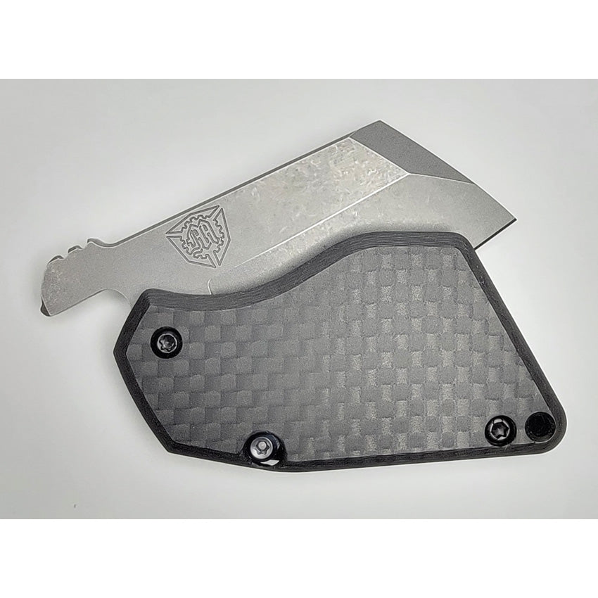 2.63" (6.68cm) closed. 1.88" (4.78cm) stonewash finish CPM-154 stainless blade. Black G10 handle with carbon fiber onlay. Lanyard hole. Extended tang. Boxed.