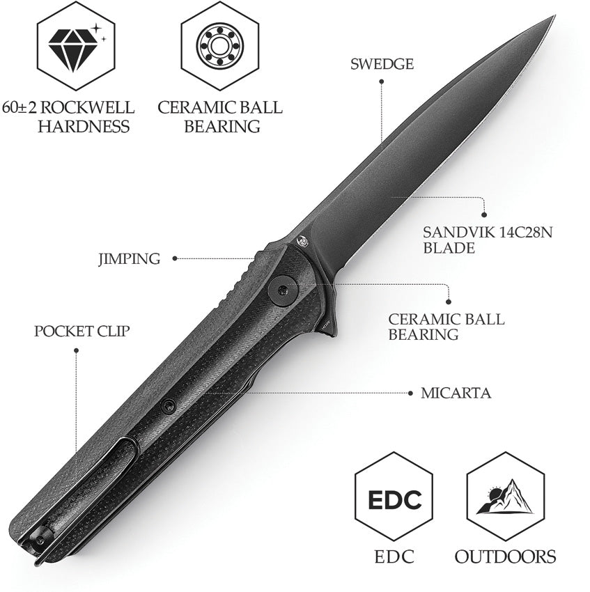 4.25" (10.8cm) closed. 3.38" (8.59cm) black stonewash finish 14C28N Sandvik stainless blade. Black canvas micarta handle. Extended tang. Pocket clip. Boxed.