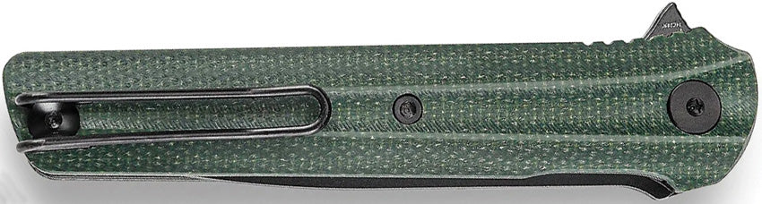 4.25" (10.8cm) closed. 3.38" (8.59cm) black stonewash finish 14C28N Sandvik stainless blade. Green canvas micarta handle. Extended tang. Pocket clip. Boxed.