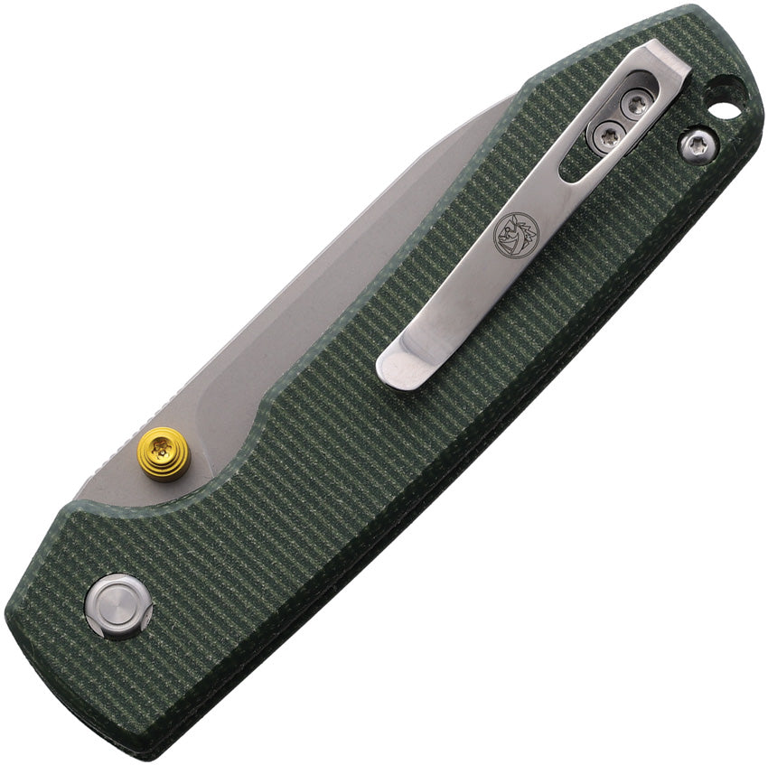 4.38" (11.13cm) closed. 3.25" (8.26cm) stonewash finish 14C28N Sandvik stainless blade. Green canvas micarta handle. Thumb stud. Lanyard hole. Pocket clip. Black nylon zippered storage case. Boxed.