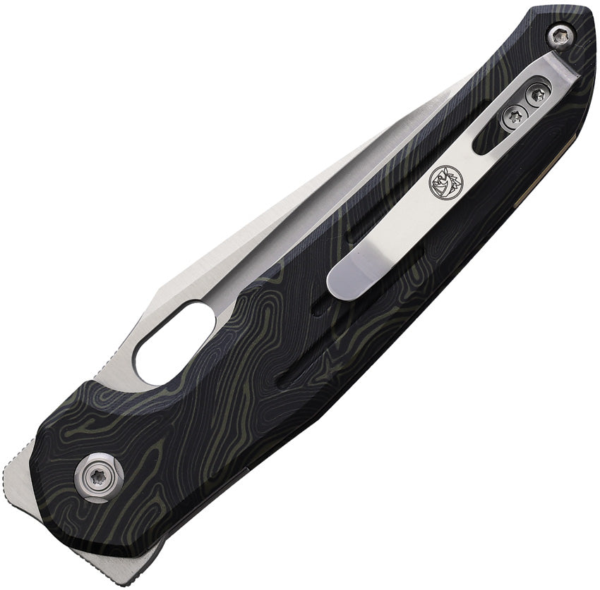 4.75" (12.07cm) closed. 3.5" (8.89cm) satin finish S35VN stainless tanto blade. Green G10 handle. Thumb pull. Pocket clip. Topo pattern handle. Black nylon zippered storage case. Boxed.