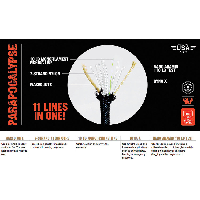 Composed of waxed jute, 10lb monofilament fishing line, Kevlar, Dyna X, and 110lb test nano aramid, and paracord. 625lb tensile strength. Cord dispenser compatible. 4mm diameter. Color: Black. 100 ft.