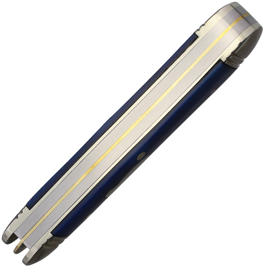 3.25" (8.26cm) closed. Satin finish D2 tool steel spear and pen blades. Blue smooth bone handle. Nickel silver bolster(s). Inlay shield. Boxed.