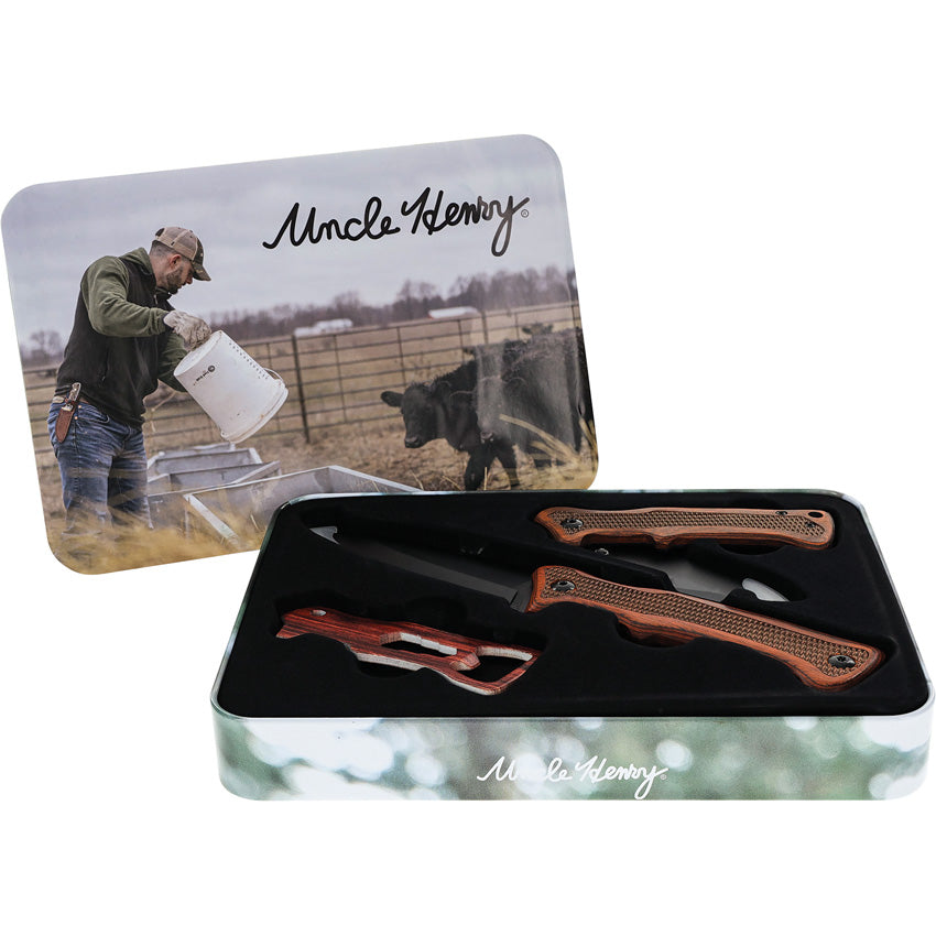 Uncle Henry. Black finish stainless blade. Brown pakkawood handle. Includes: 8" overall fixed blade with 3.75" blade and full tang; 4" closed linerlock with 3" blade, lanyard hole, and pocket clip; Bottle opener. Clam packed.