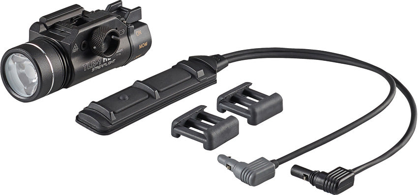 3.75" overall. Tailcap switch. TLR-1HL weapon mountable light. Also includes dual remote pressure switch, mounting clips, adhesive pads,and cable ties. Allows for simultaneous or individual activation of the Streamlight TLR-1 HL and accompanying external aiming device. Pressure switches permit momentary or constant on activation. Mounts directly to all MIL-STD-1913 (Picatinny) rails. Requires (1) Lithium battery . Aluminum construction. Color: Black. Boxed.