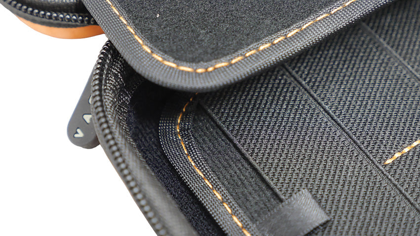 Dimensions: 7" x 4.5" x 2". Three inner flex panels are modular and removable for easier access to contents. Panels also feature a pull tab for easier removal and placement. Orange carbon fiber pattern outer shell. Bulk packed.