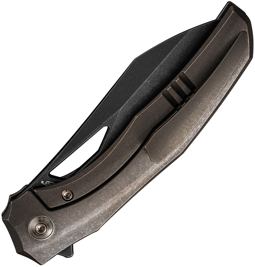 4.38" (11.13cm) closed. 3.38" (8.59cm) black stonewash finish CPM-20CV stainless blade. Bronze stonewash finish titanium handle. Extended tang. Pocket clip. Thumb pull. Wharnto (Wharncliffe/tanto) blade. Black nylon zippered storage case. Boxed.