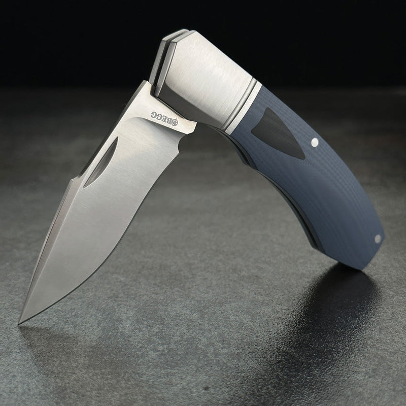 4" (10.16cm) closed. 2.88" (7.32cm) satin finish 14C28N Sandvik stainless blade. Blue G10 handle. Stainless bolster(s). Inlay shield. Recurve blade. Black nylon zippered storage case. Boxed.