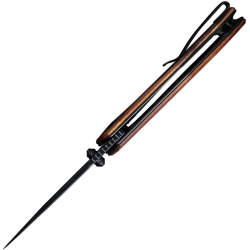 4.13" (10.49cm) closed. 3" (7.62cm) Damascus steel blade. Extended tang. Thumb stud. Pocket clip. Cuibourtia wood handle. Black nylon zippered storage case. Boxed.