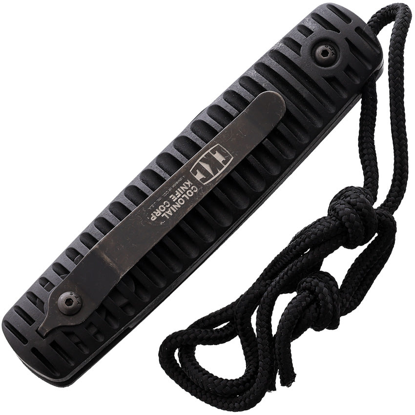 Automatic opening. 4.25" (10.8cm) closed. 2.75" (6.99cm) black oxide coated partially serrated stainless tanto blade. Black grooved polymer handle. Blade etching. Lanyard hole. Cord lanyard. Safety mechanism. Blackie Collins blade design. Boxed.