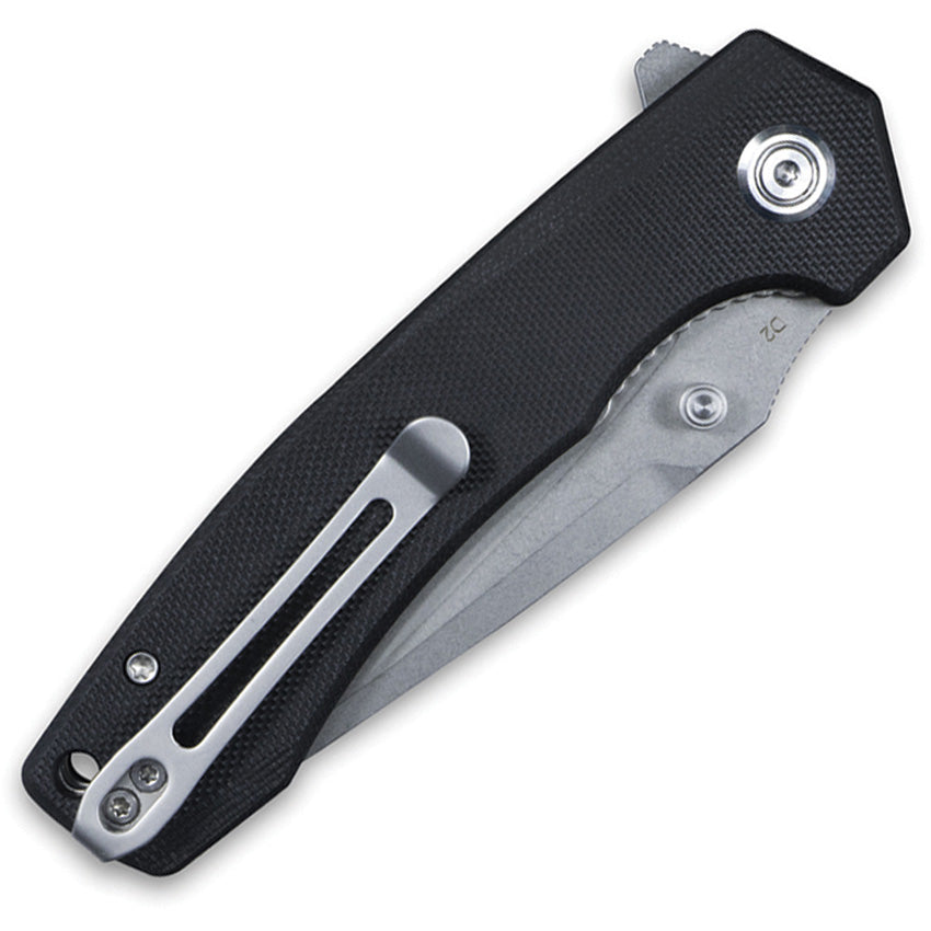 4.5" (11.43cm) closed. 3.25" (8.26cm) stonewash finish D2 tool steel blade. Black G10 handle. Extended tang. Thumb stud. Lanyard hole. Pocket clip. Boxed.