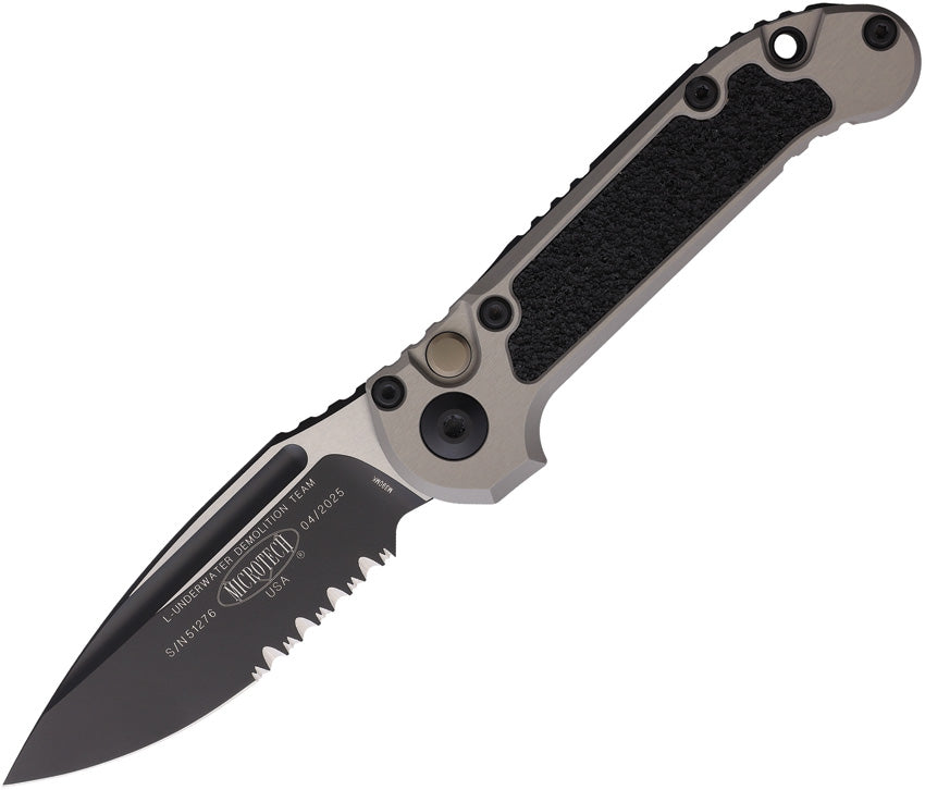 Automatic opening. 4.5" (11.43cm) closed. 3.5" (8.89cm) two-tone finish partially serrated Bohler M390MK stainless blade. Gray aluminum handle with black traction insert. Lanyard hole. Pocket clip. Boxed.