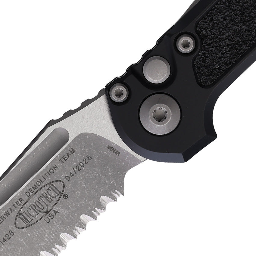 Automatic opening. 4.5" (11.43cm) closed. 3.5" (8.89cm) Apocalyptic finish partially serrated Bohler M390MK stainless tanto blade. Black aluminum handle with black traction insert. Lanyard hole. Pocket clip. Boxed.