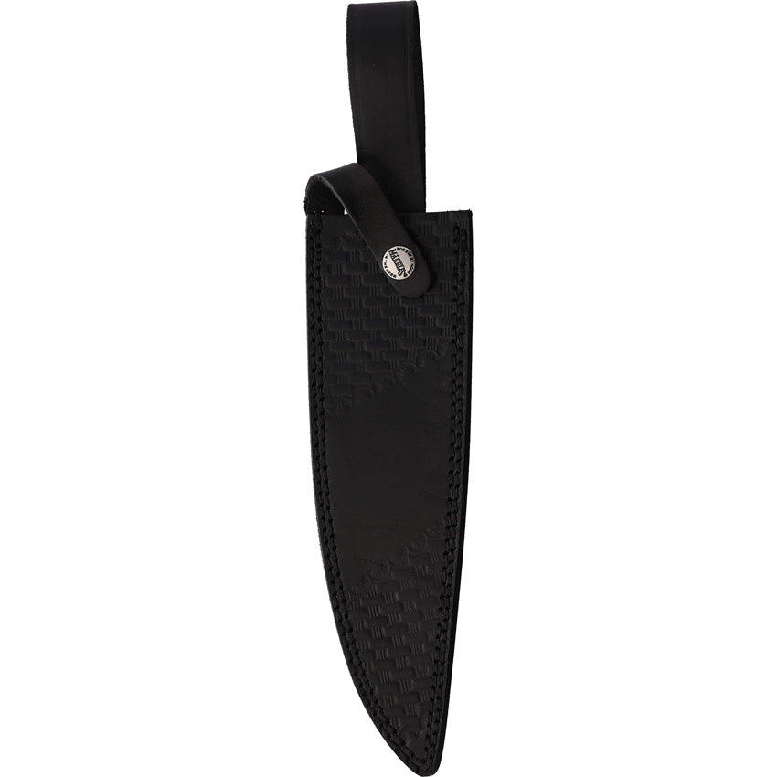 15.25" (38.74cm) overall. 10" (25.4cm) satin finish stainless bowie blade. Stainless bolster(s). Full tang. Horn and turquoise handle. Black leather belt sheath.