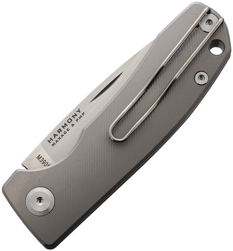 4" (10.16cm) closed. 3" (7.62cm) satin finish Bohler M390 stainless blade. Gray titanium handle. Lanyard hole. Pocket clip. Boxed.