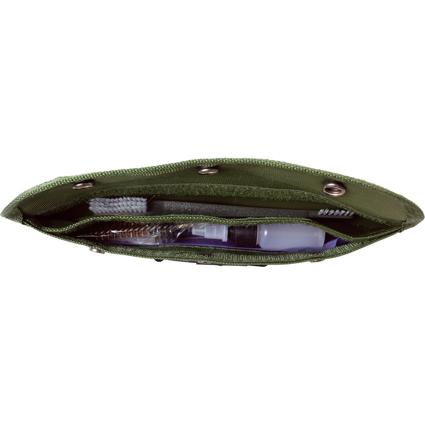 Includes: Oil bottle; Cleaning patches; Six piece rod; Double-ended brush; Bore brush (.223/5.56); Chamber brush (.223/5.56); OD green nylon rollup pouch. Hang packaged.