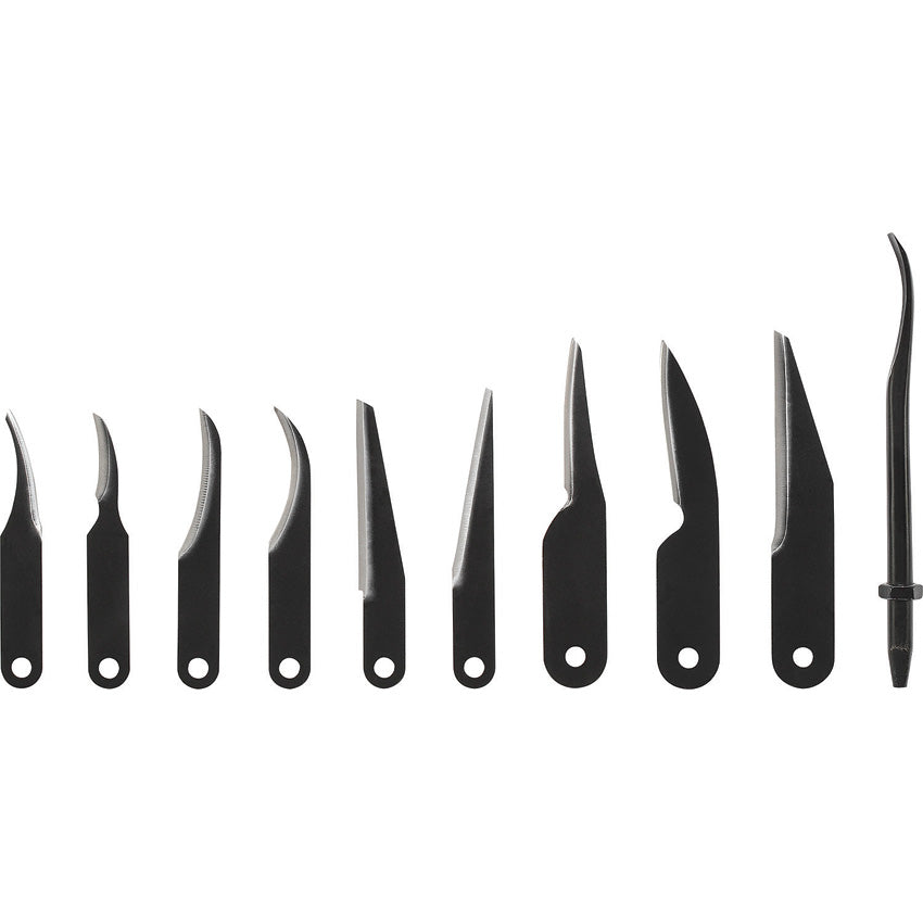 Carbon steel blade. Wood handle. Pack of 6 small detail blades: 5/16" x .030"; 20E x 15/16" radius ground on the outside curve; 21EX straight blade; 11 straight blade ground on the slanted edge; 10 1" radius ground on the inside curve; 8 2" radius ground on the inside curve; 22 2" radius ground on the inside curve; 1-LD2 1/2" x .050" heavy duty blade; 1-LN3 1/2" x .050" carving blade; 1-LS1 1/2" x .050" carving blade, 1-LBG- #7 sweep gouge 5/16" cut. Handle with three way brass jaw chucking system. Magnetic carrying case. Boxed.