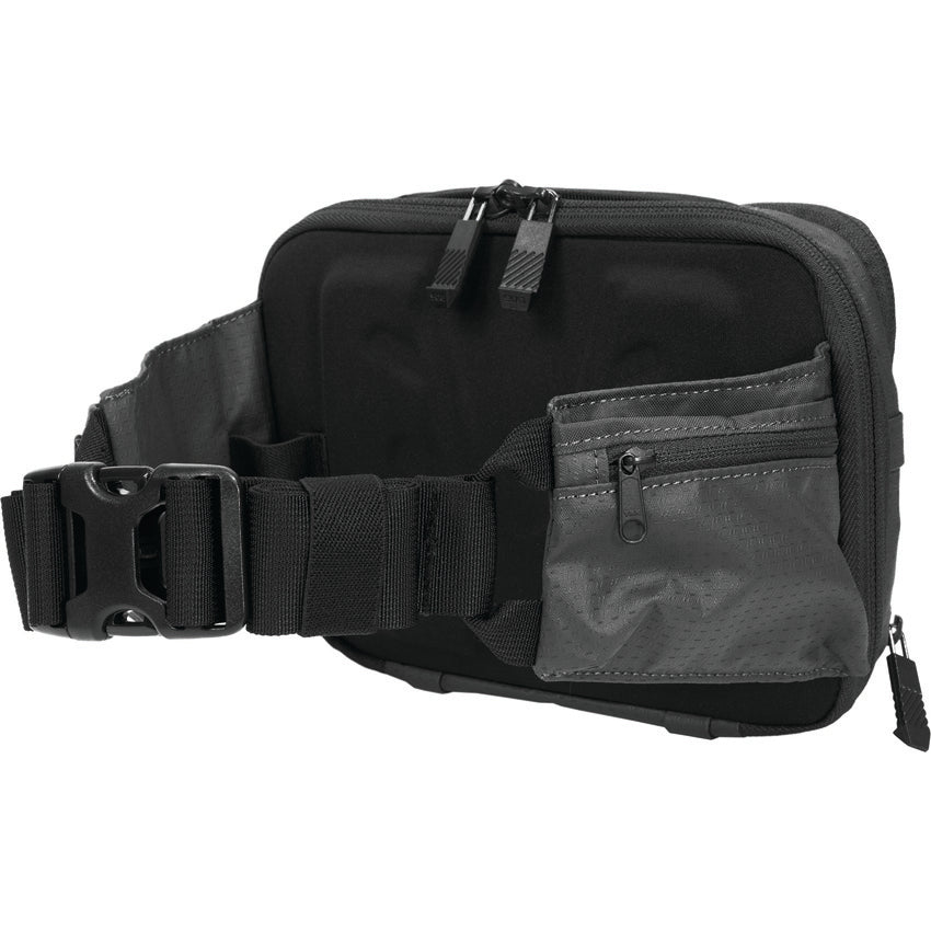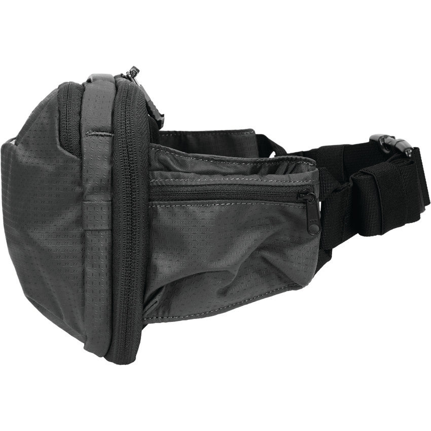 Dimensions: 9.5" x 7" x 4.5". Weight: 10.4oz. 4 liter capacity. Quick access CCW pocket. Covert storage for valuables. Can be carried across your shoulder or at your waist. Dedicated knife pocket. Locking zippers. Water resistant. 4200 Nylon Ripstop construction. Color: Black. Bulk packed.