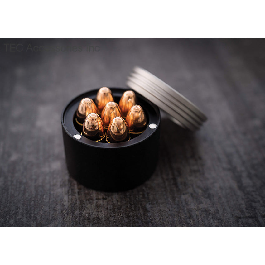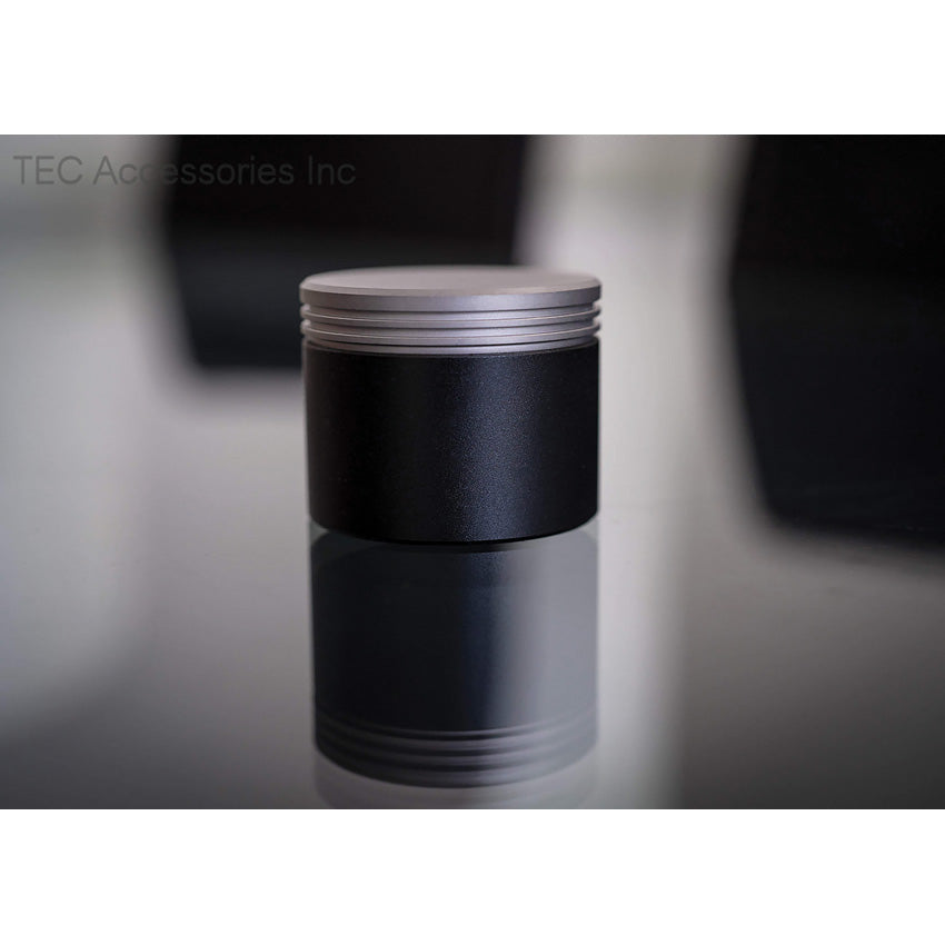 Black anodized finish aluminum body. Stainless cap held in place with three neodymium magnets. Can be used to store any small items. Outside dimensions: 1.56" diameter; 1.25" height. Inside dimensions: 1.18" diameter; 1.14" height. Comes in foam-lined plastic tube.