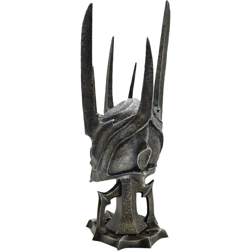 15.5" tall. Half scale poylresin replica of the blackened steel war helm of the Dark Lord Sauron, as seen in the motion picture, ÒThe Lord Of The Rings: The Fellowship Of The Ring". This is a scale reproduction of the actor-scale filming prop built by the filmÕs production team. Features weathered intaglio-etched surface sculpting and blackened sleek coloring that precisely match the original movie prop. Close attention to detail is a top priority in every piece. It is presented with a polystone display stand sculpted in the same styling as the mace and armor of Sauron and includes a certificate of authenticity.