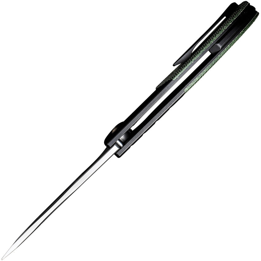 4.75" (12.07cm) closed. 3.75" (9.53cm) bead blast finish CPM-20CV stainless blade. Green micarta handle. Titanium bolster(s). Extended tang. Pocket clip. Black nylon zippered storage case. Boxed.
