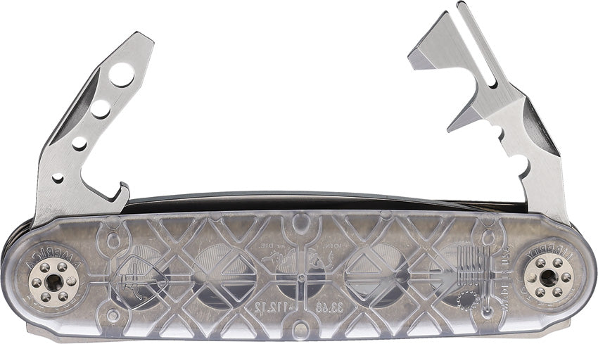 3.63" (9.22cm) closed. Premium steel blade. Clear synthetic handle. Tools include: Bottle opener l Screwdriver tip. AR-15 compatible bolt scraping tool I Range finder. Boxed.