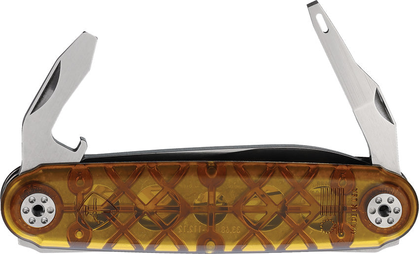 3.63" (9.22cm) closed. Premium steel blade. Ultem handle. Tools include: Awl l Bottle opener l Flat head screwdriver. Boxed.