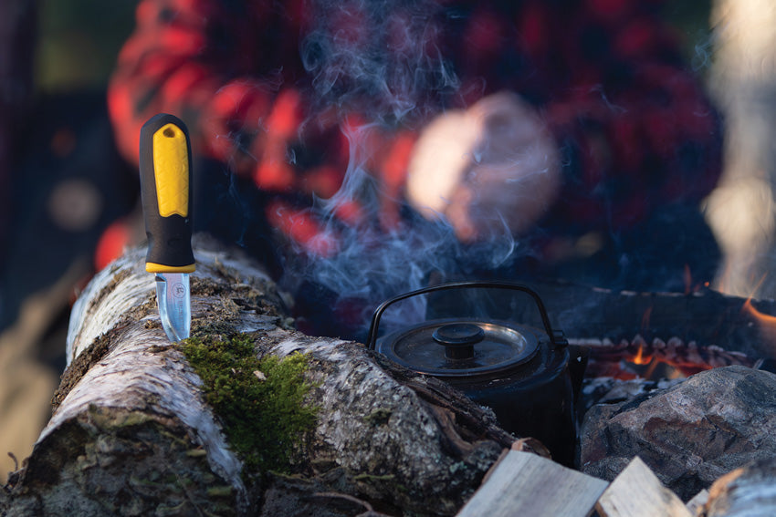 6" (15.24cm) overall. 2.13" (5.41cm) satin finish 1.4116 stainless blade. Black and yellow TPE handle. Attachment clip. Lanyard hole. Yellow molded plastic sheath. Bulk packed.