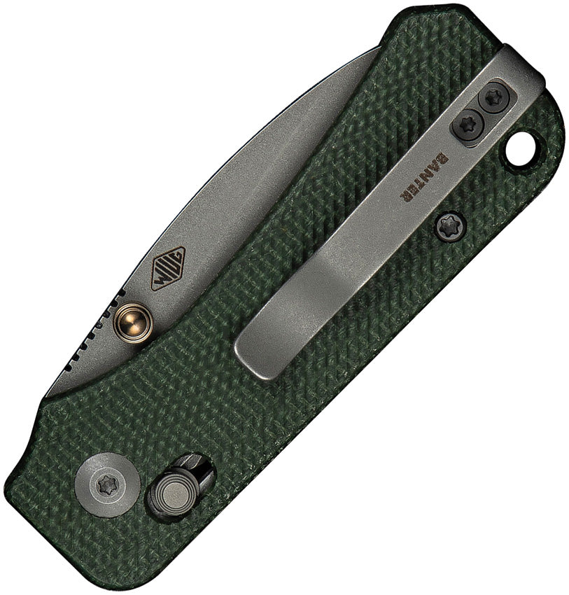 3.25" (8.26cm) closed. 2.38" (6.05cm) stonewash finish Nitro V steel drop point blade. Green canvas micarta handle. Thumb stud. Lanyard hole. Pocket clip. Boxed.